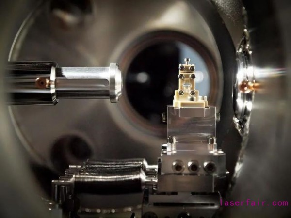 LUX 等離子體(ti) 單元(位於(yu) 白色裝片的中心),就是電子被加速的地方,隻有幾毫米長。(圖片來源:漢堡大學,Niels Delbos)
