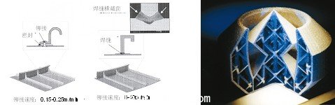 激光焊接鋁合金首先實現了機身外皮與(yu) 長桁之間的連接,並且在A318外殼係列產(chan) 品上得以實現。在該項技術中CO2激光器作為(wei) 焊接熱源,焊接材料主要為(wei) 6000係列,這種材料在添加填充焊絲(si) 的情況下具有較好的可焊性。這樣使用填充焊絲(si) 的激光雙麵焊接技術取代了傳(chuan) 統的蒙皮#p#分頁標題#e#-長桁間的鉚接過程,如圖1。激光焊接結構降低了對材料的消耗,減輕了飛機的重量,減少了生產(chan) 工藝步驟,提高了製造速度,從(cong) 整體(ti) 上實現了降低成本的目標。另一方麵由於(yu) 沒有鉚接用孔以及鉚接連接所需的搭接結構,改善了飛機的氣體(ti) 動力學性能,一體(ti) 化的製造方式同時也降低了飛機的維修成本。