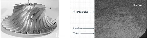 圖3 a)采用LENS製造的先進渦輪發動機的三合金葉輪;b) Ti6Al4V與(yu) γ-TiAl(Ti48Al2Cr2Nb)的連接界麵