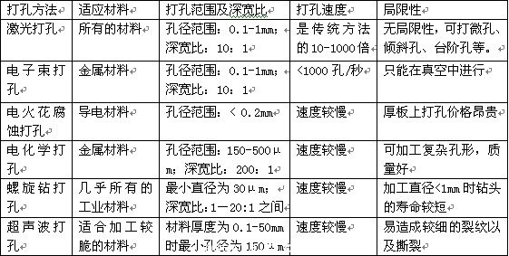 表1 激光打孔方法與(yu) 傳(chuan) 統打孔方法技術指標的對比