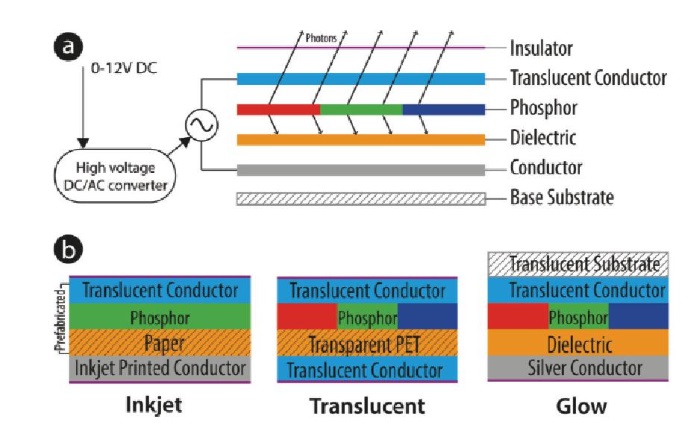 這種交互式顯示屏由四層組成,因此軟件需要生成四個(ge) 副本,然後使用噴墨打印機或絲(si) 網印刷設備將其3D打印在對象物體(ti) 或紙張上:顯示屏的每一層都會(hui) 從(cong) 底部到頂部連續打印[...]對於(yu) 多色顯示,需要打印兩(liang) 層或者更多層不同顏色的熒光體(ti) 。這四個(ge) 層內(nei) 包含了所有製造觸摸屏所需的必要導電元件。最後,用一層亞(ya) 克力絕緣噴霧覆蓋在頂層上。總的來說,在基板上增加了大約110微米的厚度。