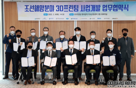 2月8日,韓國蔚山信息產(chan) 業(ye) 振興(xing) 院(UIPA)、韓國生產(chan) 技術研究院(KITECH)、韓國3D打印融合技術協會(hui) 、韓國船級社(KR)、現代重工、Hankook Steel co.,LTD等11家相關(guan) 機構和企業(ye) 齊聚在韓國造船重鎮——蔚山市3D打印風險聚集知識產(chan) 業(ye) 中心,簽訂了“造船海洋領域3D打印事業(ye) 開發業(ye) 務協議”。