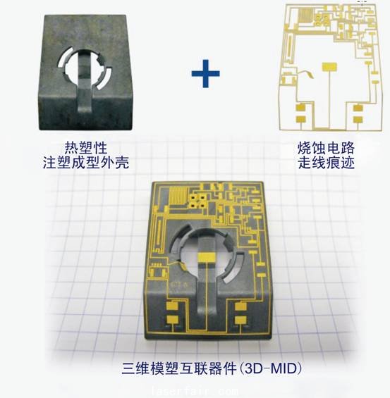 激光直接成型技術在一個(ge) 注塑成型的塑料元件殼體(ti) 上,沿著殼體(ti) 輪廓在其表麵上燒蝕電路走線痕跡,從(cong) 而創建出一個(ge) 三維模塑互連器件(3D-mid)(見圖1)。在加工過程中,首先根據設計方案在塑料元件殼體(ti) 上用激光燒蝕電路走線痕跡,然後再對經過激光燒蝕的部分進行金屬化鍍層,這樣在殼體(ti) 上就形成了電子線路。元件殼體(ti) 要使用耐高溫的熱塑性材料,這樣就能夠使用標準的回流焊工藝安裝表麵貼裝元件。3D-mid帶來了非常明顯的設計和製造優(you) 勢:零部件布局更加緊湊、產(chan) 品更加小型化、質量更輕、裝配時間大大縮短、產(chan) 品可靠性更高,同時其還有望在醫療、汽車、工業(ye) 和軍(jun) 事/國防領域的一些新興(xing) 應用中,降低總體(ti) 係統成本。