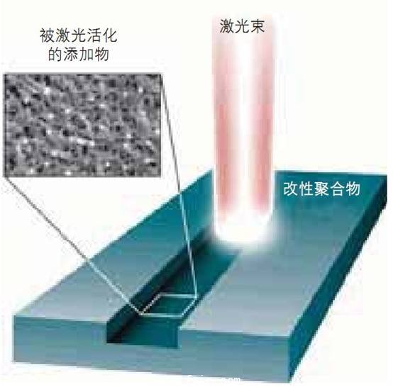 圖2:激光直接成型(LDS)刻蝕高分子材料,進而創造出一個(ge) 活化的粗糙表麵,以易於(yu) 實現金屬鍍層。