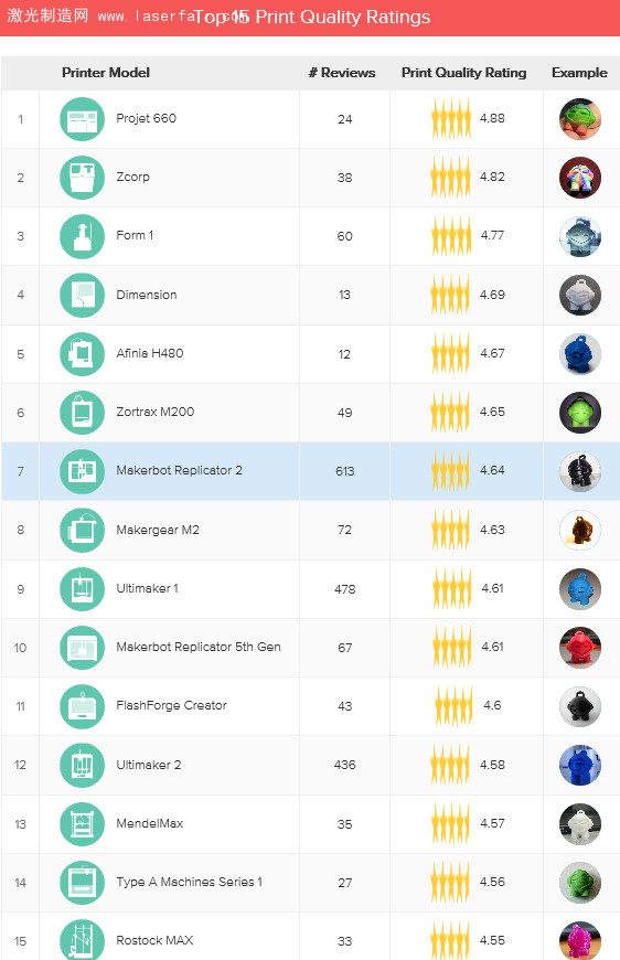 該報告列出了8月份打印質量評價(jia) 最高的前15款3D打印機。其中兩(liang) 款專(zhuan) 業(ye) 級的3D打印機,即3D Systems公司的Projet 660、Zcorp分列前兩(liang) 名。上個(ge) 月排名第一的Form1 SLA 3D打印機,本月下滑兩(liang) 位,列第三。Afinia H480本月頭次上榜即名列5位,讓人印象深刻。需要指出的是,Afinia為(wei) 我國3D打印機廠商北京太爾時代在美國的貼牌產(chan) 品。