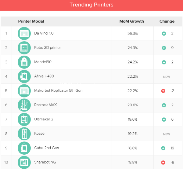 在用戶擁有量增長最快的3D打印機排行榜上,來自台灣的 Da Vinci 1.0以56.3%的月增幅高居第一。這與(yu) 該產(chan) 品的低價(jia) 策略有一定的關(guan) 係,Da Vinci 1.0的售價(jia) 大約為(wei) 500美元左右。 Robo 3D打印機也呈加速增長態勢,上個(ge) 月增幅還僅(jin) 為(wei) 第11名,本月即以24.3%的增幅占據第二位。新上榜的Afinia H480本月增幅位居第四,同樣引人注目。