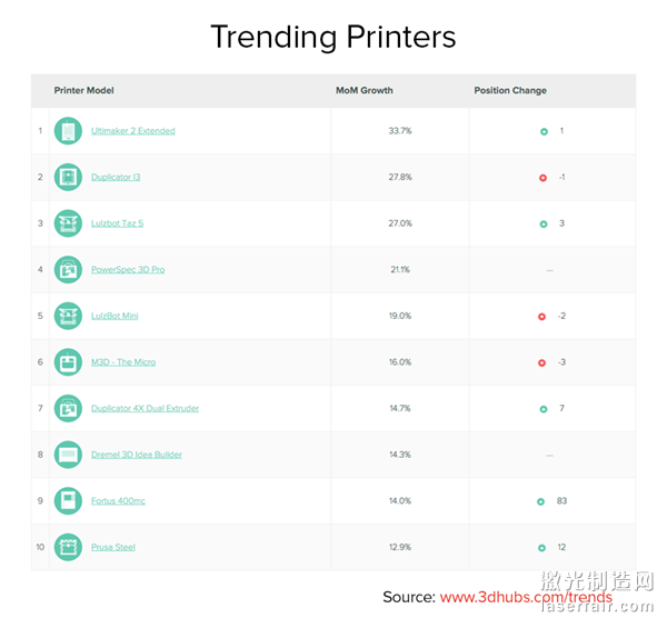而在3D打印機的增長趨勢排行榜上就變化比較大了,由於(yu) 這裏隻比較增長率,因此我們(men) 經常能夠看到很多新麵孔出現。Ultimaker 2本月上升一位成了增長最快的3D打印機品牌。而最近剛獲《Make:》雜誌評測大獎的LulzBot TAZ 5不出意料,從(cong) 第5位一躍升至第2。而正式上市不久的Micro 3D打印機跌出了前五名,月度增速為(wei) 16%,而3D Hubs指出由於(yu) 該公司在Kickstarter售出的1萬(wan) 多台3D打印機剛剛交貨不久,因此不能指望它會(hui) 增長得很快。