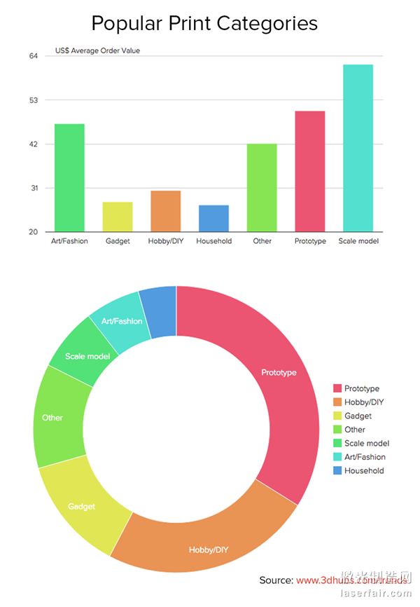 在平均訂單金額的分類別比較上,愛好/DIY、家庭用品和原型3D打印的訂單金額有所增加,而其他類別顯示略有減少。而在其市場份額方麵,本月藝術與(yu) 時尚方麵的3D打印訂單數量增加,而對於(yu) 愛好/DIY和比例模型打印方麵的需求略有下降。至於(yu) 顏色,黑色和白色依然是3D打印用戶的主要選擇。