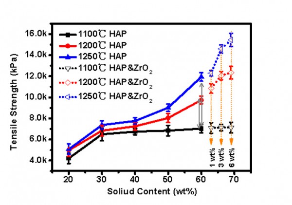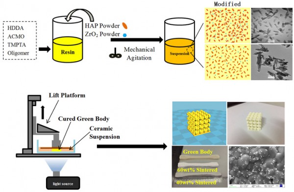 由於增材製造技術具有高精度選擇性固定和快速成型等優點,將其應用於骨缺損修複成為研究熱點之一。羥基磷灰石(HAP)是目前最常用的磷酸鈣生物材料之一,與人體骨骼的主要成分非常接近。因此,羥基磷灰石生物材料作為骨移植材料受到廣泛的歡迎。利用數字光處理(DLP)的3D打印技術製備HAP生物陶瓷是一項潛力巨大的工作。然而,製備固體含量高、流動性好、可由DLP打印的HAP雜化懸浮液遇到了不少挑戰。因此,本研究的目的是改進和發展一種新型的高固載紫外光固化懸浮液,該懸浮液具有良好的流體力學性能和穩定性,適合於DLP光固化打印機,以在一定程度上補償HAP陶瓷本身的脆性,在懸浮液中加入少量的氧化鋯作為添加劑,通過3D打印DLP製備了氧化鋯增韌HAP生物陶瓷複合材料。本研究采用兩種有機改性劑對HAP粉體進行預改性,以改善其在丙烯酸樹脂體係中的相容性,並加入蓖麻油磷酸酯進一步降低懸浮液的剪切應力,以保證其具有較強的流動性。60wt%粉體粒子負載的UV懸浮液在30rpm下的最小粘度為7495mPa?s,分別在1100℃、1200℃和1250℃下真空燒結。複合陶瓷(含6 wt%ZrO2)在1200℃時的相對密度為90.7%,而在1250℃燒結的樣品具有較強的拉伸強度和彎曲強度。氧化鋯摻入對HAP陶瓷的增韌作用也通過拉伸模量和彎曲模量的變化得到證實,但相應的力學性能也有明顯提高。該成果發表在國際刊物(C. Zhang, D. Huang, S. F. Liu, X. M. Dong, Y. H. Li, H. W. Zhang, Z. J. Yang, Q. S. Su, W. H. Huang, W. X. Zheng, W. Y. Zhou. Zirconia toughened hydroxyapatite biocomposite formed by a DLP 3D printing process for potential bone tissue engineering[J]. Materials Science & Engineering C, 2019, 105, 110054.)