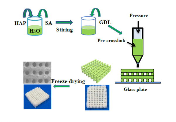 圖1 基於(yu) 3D打印構建海藻酸鈉/羥基磷灰石多孔凝膠支架的示意圖