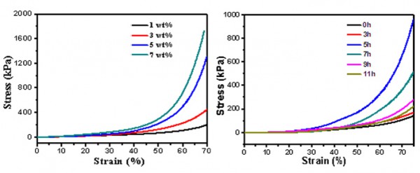 該多孔支架經過兩級交聯,具有良好的力學性能,該水凝膠支架在壓縮率為75%的時候壓縮應力為970kPa。將HAP納米顆粒加入到支架中,體外生物礦化實驗表明多孔支架具有良好的生物活性。