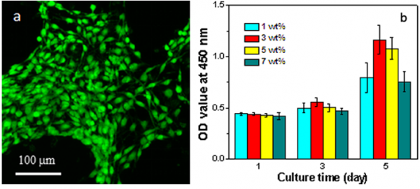 圖3 (a)骨髓間充質幹細胞在含羥基磷灰石3%的凝膠支架上培養5天的激光共聚焦照片,(b)骨髓間充質幹細胞在含不同羥基磷灰石的凝膠支架上培養1,3,5天後的增殖性能。