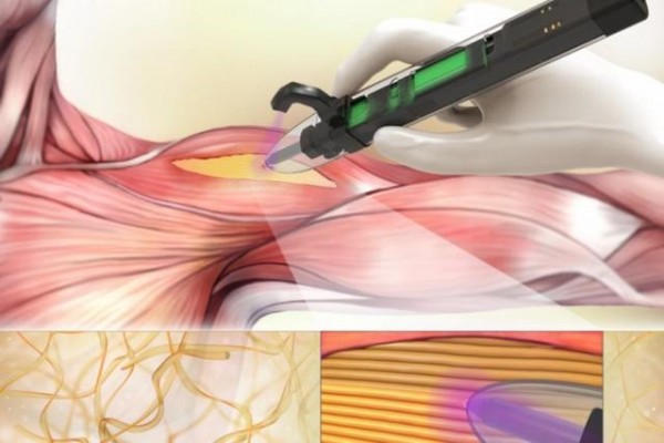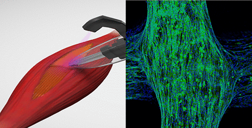 首先,科學家將基於明膠的水凝膠直接沉積到肌肉內不需要的間隙中。集成的紫外線可使凝膠固化成由微小的類肌肉纖維組成的生物支架,該生物支架易於粘附在相鄰的肌肉組織上,無需縫合。肌肉細胞然後進入支架。在實驗室測試中,該設備被證明可有效治療小鼠的體積性肌肉損傷。