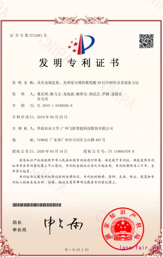 該研究成果發表在國際刊物Polymers, 同時獲得了中國授予專(zhuan) 利權,授權公告號:CN110041676B。(F. W. Yang, J. H. Zeng, H. B. Long, J. L. Xiao, Y. Luo, J. Gu, W. Y. Zhou*, Y. Wei, X. M. Dong*. Micrometer Copper-Zinc Alloy Particles-Reinforced Wood Plastic Composites with High Gloss and Antibacterial Properties for 3D Printing[J]. Polymers, 2020, 12(3), 621. https://www.mdpi.com/journal/polymers/special_issues/advances_composite_polymers_3D_printing)