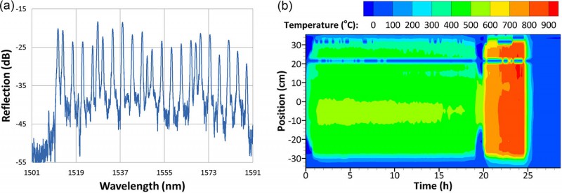 We recently deployed the fs-IR technique at a site in Canada where a research organization is exploring the use of oxy-pressurized fluidized bed combustion for power generation. For optimal efficiency, this combustion process requires accurate measurements of temperature gradients within the combustor, and these measurements are difficult to realize using standard electronic thermocouple technology. At the research site, we deployed seven arrays containing 132 fs-IR laser-written type II FBG temperature sensors to the internal thermal gradients of the fluidized bed pilot combustor. Figure shows the reflection spectrum of one of the fiber arrays, as well as temperature mapping within the fluidized bed combustor as a function of position and time during part of one thermal cycle of the combustor. The sensor arrays performed well over five months through multiple thermal cycles of up to 1025°C. The advantages of this fiber optic deployment were clearly demonstrated with respect to cable management, ease of installation, high density of sensing points,' and more rapid response to thermal changes' compared with an electronic thermocouple approach.