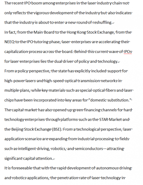 Ranging from Changjin Photonics (accepted for listing on the STAR Market) to Han's CNC and Hesai(in the queue for Hong Kong Stock Exchange listing), and on to NEEQ-listed Huaray Laser and Senfeng Laser, enterprises in the laser industry chain have formed a multi-tiered, multi-segment "listing cohort" as their listing echelon.