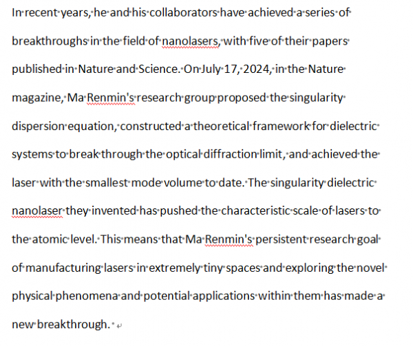 He and his team confirmed the performance advantages of plasmonic nanolasers, proposed and realized the magic-angle nanolaser, breaking the limitation that nanolasers could only achieve single or fixed-array coherent lasing. They successfully achieved a reconfigurable moiré nanolaser array. In July 2024, Ma Renmin's research group published a cutting-edge innovation in Nature titled Singularity Dielectric Nanolaser with Atomic-Scale Localized Light Field. This study proposed the singularity dispersion equation, constructed a theoretical framework to break the optical diffraction limit in dielectric systems, and achieved the smallest mode volume laser to date.