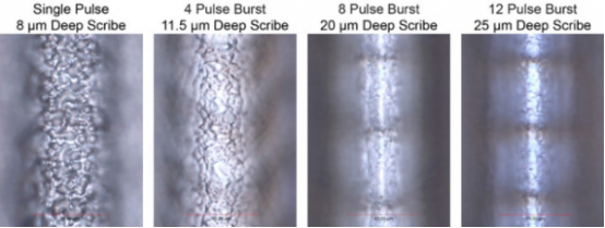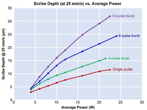 The overall results are shown in Figure 1, which depicts the dicing depth for various pulse train configurations as a function of average laser power. In each test, a total of eighty high-speed dicing passes were performed at the same location on the material. Leveraging the TimeShift function of the IceFyre laser, the position of each pulse train on the workpiece surface (e.g., total pulse overlap) can be precisely controlled. In this case, the effective spatial overlap rate of the pulses was approximately 84%, achieved by a staggered configuration of multiple pulses with fewer overlaps.