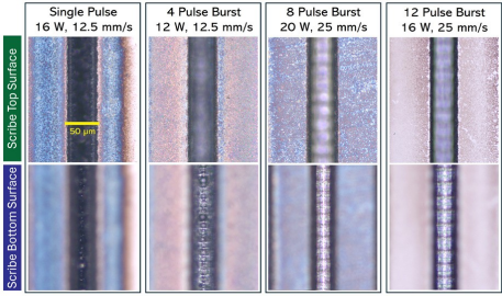 In the upper row of photographs, the microscope is focused on the top surface of the wafer, while in the lower row, the focus is on the bottom surface of the diced grooves. As the number of sub-pulses in the pulse train increases, the overall feature quality improves significantly.