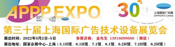 2022第三十屆上海國際廣告技術設備展覽會(hui) The 30th Shanghai International Ad & Sign Technology & Equipment Exhibition 2022年3月2-5日 March 2-5, 2022 國家會(hui) 展中心(上海) National Exhibition and Convention Center (Shanghai) 參展谘詢:金玉樂(le) 先生 13918099680(微信) QQ:564064842 與(yu) 時俱進的創新發展源於(yu) APPPEXPO上海國際廣印展持續不斷設定新目標,與(yu) 時代共進,與(yu) 企業(ye) 共成長,做行業(ye) 的引領者,做最in的展會(hui) 。為(wei) 此,每一個(ge) 廣印人一直保持著昂揚向上的鬥誌,秉承精益求精不斷創新的精神,朝著夢想不斷前行。 作為(wei) 廣告標識行業(ye) 和相關(guan) 產(chan) 業(ye) 鏈極具影響力的國際專(zhuan) 業(ye) 品牌展會(hui) ,APPPEXPO上海國際廣印展始終致力於(yu) 推動行業(ye) 不斷發展,以搭建全球貿易采購平台為(wei) 宗旨,持續為(wei) 產(chan) 業(ye) 振興(xing) 做出積極的貢獻。2022年3月2-5日,國家會(hui) 展中心(上海)APPPEXPO上海國際廣印展將迎來她的30周年慶典。 2021 APPPEXPO上海國際廣印展在參展企業(ye) 數、展覽麵積與(yu) 專(zhuan) 業(ye) 觀眾(zhong) 人次等方麵都達到了疫情爆發後50%以上的恢複性增長,總展覽麵積超過170,000㎡,橫跨8大展館、覆蓋10大領域,更有逾1,400家參展企業(ye) 競相發布新產(chan) 品、新技術、新材料和新設計,現場共吸引112,068人次的專(zhuan) 業(ye) 觀眾(zhong) 與(yu) 買(mai) 家。 展館分布及展品範圍 5.1H館-國際品牌綜合 數碼噴印設備 | 數碼影像技術輸出設備 | 數碼紡織印花設備 | 廣告耗材等 6.1H館-國際品牌綜合 數碼噴印設備 | 數碼影像技術輸出設備 | 數碼紡織印花設備 | 廣告耗材等 7.1館--標識及數字標識/LED照明 標牌 | 標識產(chan) 品 | 三麵及多麵翻 | 新媒體(ti) | 數字標牌 | LCD廣告機 | 3D立體(ti) 產(chan) 品 | LED廣告光源 | LED模組 |燈箱 | 發光產(chan) 品 | LED顯示屏 | LED/LCD電視等 8.1館--雕刻機 雕刻機 | 激光雕刻機 | CNC雕刻係統 | 刀具及配件 | 標牌設備 | 吸塑機 | 亞(ya) 克力設備 | 切割機 | 刻字機 | 彎字機 | 拋光機等 6.2H館-廣告介質及材料 噴繪布 | 膠粘製品 | 反光材料 | 相紙及相關(guan) 戶內(nei) 外數碼打印耗材 | 墨水 | 油墨 | 亞(ya) 克力板材 | PVC發泡板 |鋁塑板等 展覽展示 展覽展示器材 | 便攜式展具係列 | 展架及其他POP產(chan) 品等 7.2H館-數碼噴印技術設備 數碼噴繪設備 | 戶內(nei) 外數碼寫(xie) 真設備 | UV平板打印機 | UV卷材打印機 | UV板卷打印機 | 數碼影像技術輸出設備 | 條幅機 | 冷裱機 | 接駁機 | 覆膜機 | 噴印設備相關(guan) 耗材及配件等 數字印花 |數字噴墨紡織印花設備|數字噴墨紡織印花係統|紡織物印花品|數字印花耗材等 8.2H館-數碼噴印技術設備 數碼噴繪設備 | 戶內(nei) 外數碼寫(xie) 真設備 | UV平板打印機 | UV卷材打印機 | UV板卷打印機 | 數碼影像技術輸出設備 | 條幅機 | 冷裱機 | 接駁機 | 覆膜機 | 噴印設備相關(guan) 耗材及配件等 圖文快印 |印前設備及軟件|印中設備|印後設備|相關(guan) 配件及耗材|個(ge) 性化產(chan) 品及設備|材料及其他等 主辦單位聯係方式: 上海新格雷展覽服務有限公司 地 址:上海市陝西北路1438財富時代大廈4層 電 話:021-34080092 手 機:13918099680 聯係人:金玉樂(le) Q Q :564064842 |