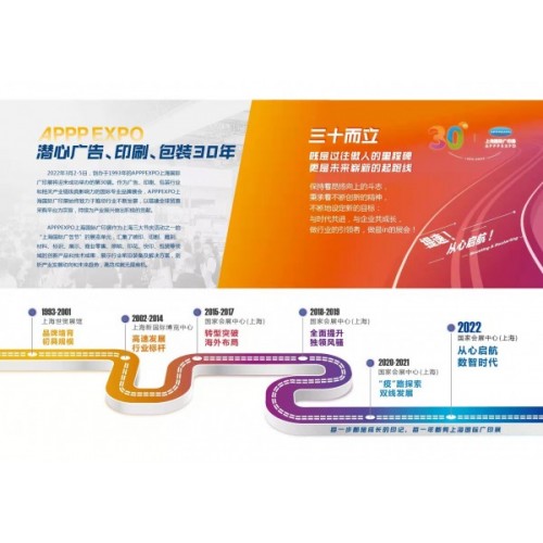 作為(wei) 廣告標識行業(ye) 和相關(guan) 產(chan) 業(ye) 鏈極具影響力的國際專(zhuan) 業(ye) 品牌展會(hui) ,APPPEXPO上海國際廣印展始終致力於(yu) 推動行業(ye) 不斷發展,以搭建全球貿易采購平台為(wei) 宗旨,持續為(wei) 產(chan) 業(ye) 振興(xing) 做出積極的貢獻。2022年3月2-5日,國家會(hui) 展中心(上海)APPPEXPO上海國際廣印展將迎來她的30周年慶典。