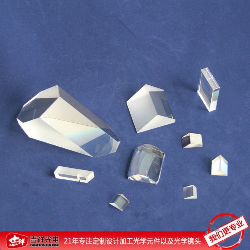 直角棱鏡可通過全內(nei) 反射作用,使光線發生90°的轉變,同時也可以作為(wei) 一個(ge) 反射鏡,使光線發生180°的轉變。在入射麵和出射麵會(hui) 有部分反射損失光線,在長波段範圍,直角棱鏡全內(nei) 反射的反射率可以達到100%。由於(yu) 直角棱鏡本身有較大的接觸麵積以及有45°,90°這樣典型的角度,因此和普通的反射鏡相比,直角棱鏡更容易安裝,對機械應力具有更好的穩定性和強度。它們(men) 是各類裝置和儀(yi) 器用光學件的最佳選擇。