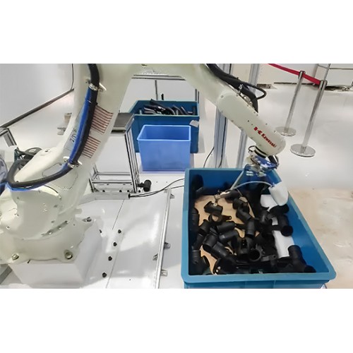 膠管無序擺放在料框中,3D視覺對工件進行識別和定位,引導機器人實現對膠管的無序抓取並上料,用機械臂替代人工,抓取精度±0.25mm,可24小時穩定運行。