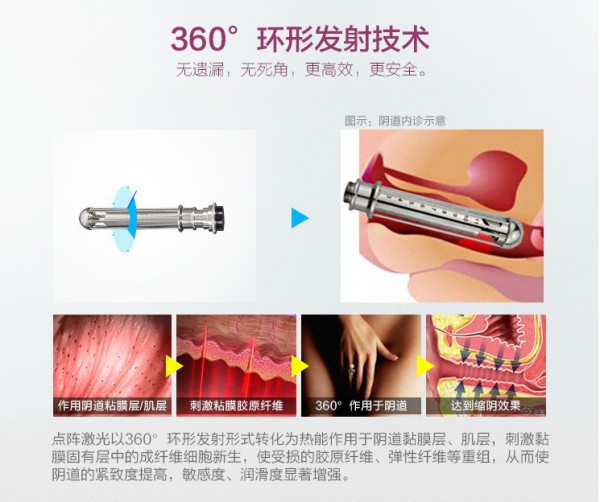 通過鍍金的360反射手具,以環形的發光模式作用到陰道壁。以不接觸陰道壁的方式,將能量均勻全麵的作用到陰道全段,操作簡便,作用時間短,安全性更高。