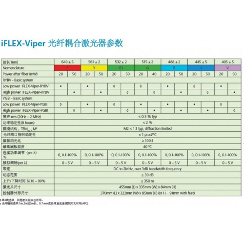 該激光器具有良好的性能,比相幹coherent激光器具有更好的信噪比和穩定性。在高質量的生物成像中,市場越來越流行使用多波長激光。iFLEX-Viper係列最多提供5波長組合,應用於(yu) 激光掃描共聚焦顯微、流式細胞儀(yi) 、DNA篩選、生物計量檢測等。閉環調製特性(CLM)特性為(wei) iFLEX-激光係統提供調製能力,無需重新校準,並在激光生命周期內(nei) 提供超低噪音和異常功率穩定性。