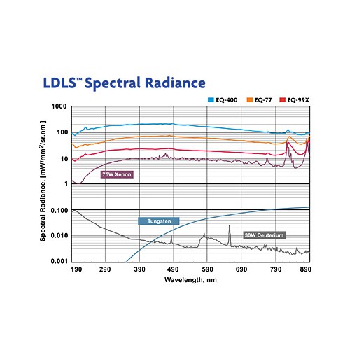 ENERGETIQ光源是一款高亮度、高穩定、長壽命的寬譜光源,其采用革命性的光源技術—— LDLS ™激光驅動光源技術,利用連續激光直接加熱氙離子至需要的溫度,以產(chan) 生高效的寬頻譜光。該產(chan) 品具有很寬的光譜範圍,譜線包括軟 X 射線(SXR),遠紫外線(EUV), 深紫外線(DUV), 並覆蓋從(cong) 可見光到紅外光區(IR),波長範圍從(cong) 170nm到2100nm以上。無電極的LDLS技術可以產(chan) 生小體(ti) 積高亮度的等離子體(ti) ,實現高效的集光和從(cong) 深紫外到可見光甚至更長波段的寬光譜,並且延長了燈的使用壽命。