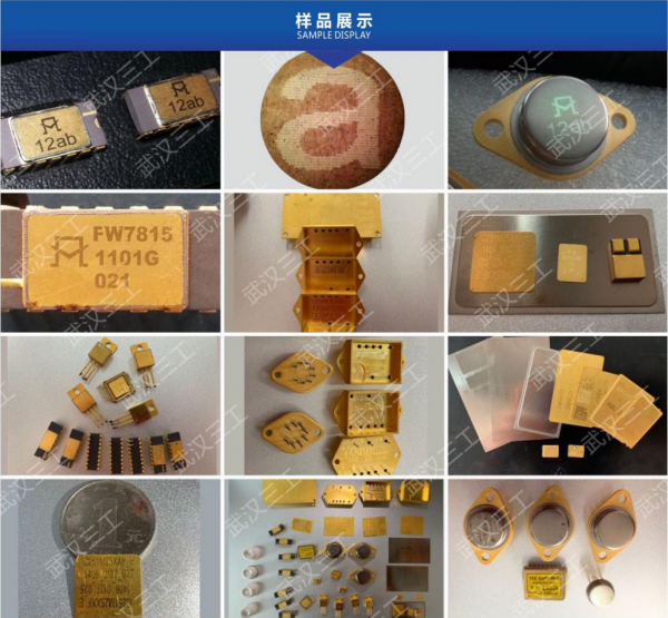 海洋艦船、飛機上使用的集成電路,其外封裝上鍍金或者鎳的防腐層,用傳統方式印刷的標誌,會因腐蝕而消退、消失,用普通激光雕刻時,會造成鍍金層的破壞從而破壞其防腐能力,本公司專門針對這一應用,開發出一款精細激光打標機,很好的解決了這些難題。