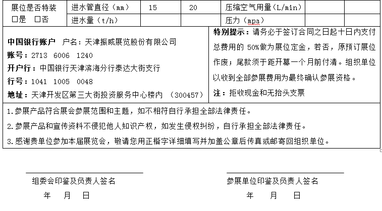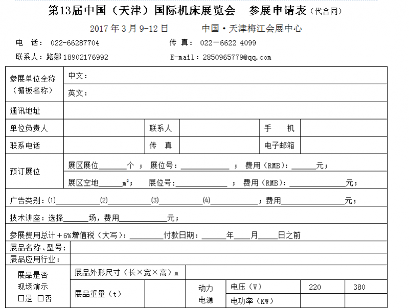 第13屆中國(天津)國際機床展覽會 參展申請表(代合同)