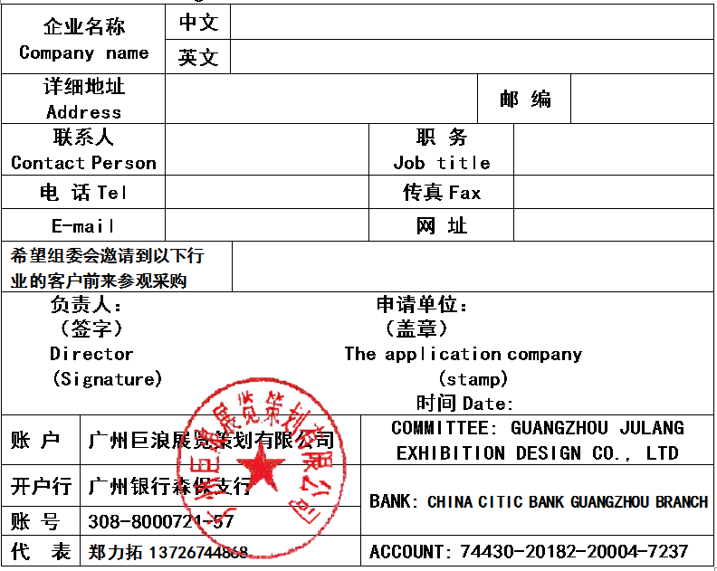 備注:本表僅為企業申請報名所用,正式展位必須在報名三天內,匯出參展費用並傳真銀行匯款單後,我司回傳展位確定書為準,否則,展位給予撤銷.