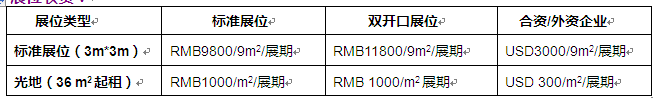 標準展位: (3M×3M)展位(包括三麵圍板、楣板、一桌二椅、220V電源插座、清潔費等)。