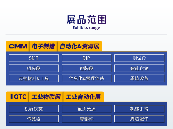 CMM 2022展品內(nei) 容將全麵覆蓋從(cong) 設備到周邊部件,從(cong) 應用軟件到信息技術,形成SMT、DIP、測試段、組裝段、包裝段、智能倉(cang) 儲(chu) 、周邊設備、芯片半導體(ti) 、自動化部件、過程材料及工具、製造環境、信息化及管理體(ti) 係共十二大應用領域,串聯自動化部件,生產(chan) 設備,製造環境,信息技術產(chan) 業(ye) 上下遊打造智能製造行業(ye) 一站式展示平台。