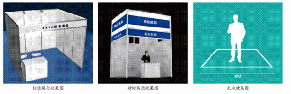2. 精標展位基本配置:3m×3m展位(包括精裝標準展台、布幅廣告門楣、地毯、一桌兩(liang) 椅、門楣射燈、展位射燈、220V電源插座);