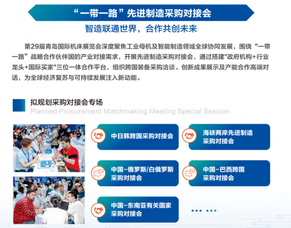 第29屆青島國際機床展覽會(hui) 深度聚焦工業(ye) 母機及智能製造領域全球協同發展,圍繞“一帶一路”戰略合作夥(huo) 伴國的產(chan) 業(ye) 對接需求,開展先進製造采購對接會(hui) ,通過搭建"政府機構+行業(ye) 龍頭+國際買(mai) 家"三位一體(ti) 合作平台,組織跨國裝備采購洽談、創新成果展示及產(chan) 能合作高端對話,為(wei) 全球經濟複蘇與(yu) 可持續發展注入新動能。