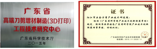 研究院在項目開發的同時,也積極開展五金刀剪產(chan) 業(ye) 公共技術服務平台的建設。研究院通過了廣東(dong) 省第二批新型研發機構的認定;組建的《廣東(dong) 省高端刀剪增材製造(3D打印)工程技術研究中心》通過了廣東(dong) 省科技廳的認定;作為(wei) 牽頭單位,組建的《廣東(dong) 省五金刀剪智能製造產(chan) 業(ye) 技術創新聯盟》通過了廣東(dong) 省科技廳的認定。此外研究院還成功加入廣東(dong) 省科學院產(chan) 業(ye) 技術創新聯盟、廣東(dong) 省激光產(chan) 業(ye) 技術創新聯盟、廣東(dong) 省激光行業(ye) 協會(hui) 等,拓寬了研究院的發展道路以及與(yu) 業(ye) 內(nei) 同行的合作機會(hui) ,也為(wei) 陽江刀剪產(chan) 業(ye) 的轉型升級發展提供了更好服務平台。部分平台證書(shu) 如圖9所示。
