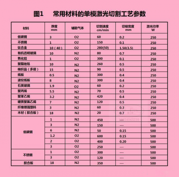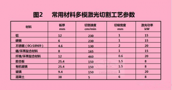 在相同功率下多模的聚焦性差,切割能力低,單模激光的切割能力和切割質量優(you) 於(yu) 多模。常用材料的單模激光切割工藝參數見圖1;多模激光切割工藝參數簡圖2。