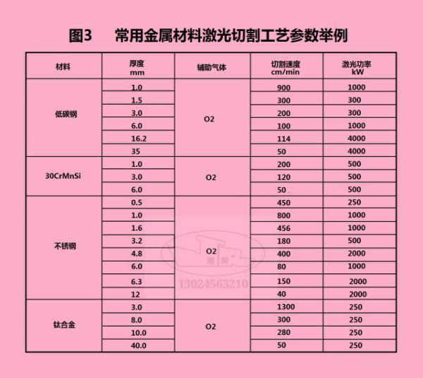 噴嘴的結構形狀和出光口尺寸大小,也影響激光切割質量和效率,不同的切割要求選用不同的噴嘴。常用的噴嘴形狀有:圓柱形、錐形、所方形等形狀。激光切割一般采用同軸(氣流與(yu) 光軸同心)吹氣方式,如氣流與(yu) 光軸不同軸,那麽(me) 在切割時易產(chan) 生大量的飛濺。為(wei) 保證切割過程的穩定性,通常要控製噴嘴端麵與(yu) 工件表麵的距離,一般為(wei) 0.5~2.0mm,以便切割順利進行。常用金屬材料激光切割的工藝參數見圖3。