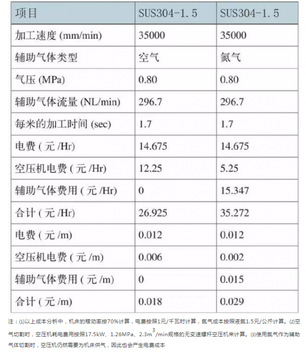 下麵,以1.5mm厚304不鏽鋼為(wei) 例,分析空氣和氮氣分別作為(wei) 輔助氣體(ti) 時的切割成本,如表1所示。對比中使用的機型為(wei) AMADA公司最新一代光纖激光切割機,所搭載的是自主研發的光纖激光發振器。