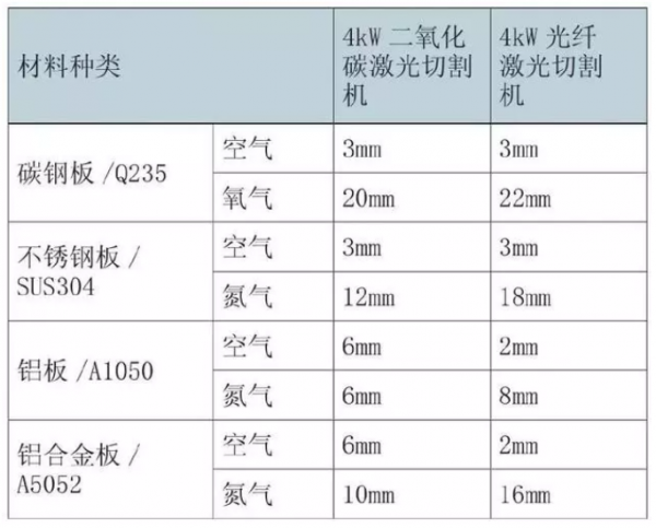 二氧化碳激光切割機和光纖激光切割機使用空氣作為(wei) 輔助氣體(ti) 時的切割加工範圍如表2所示。