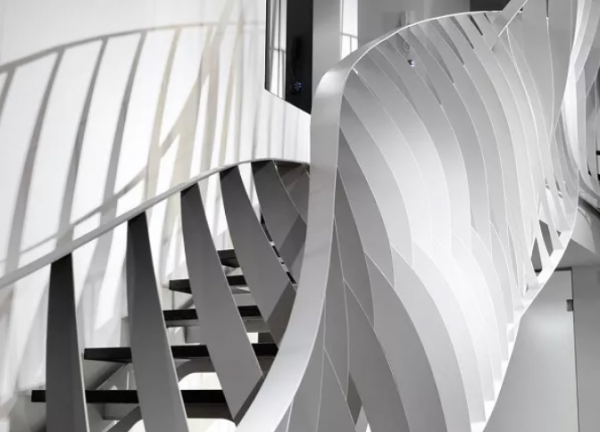 激光切割鋼材做成的樓梯,竟然也能婀娜多姿?設計師的巧妙設計,原本生硬的鋼材,經過激光切割機加工,再進行現場定位焊接之後,呈現出流線形狀,成為(wei) 與(yu) 生活中常見樓梯截然不同的藝術品。