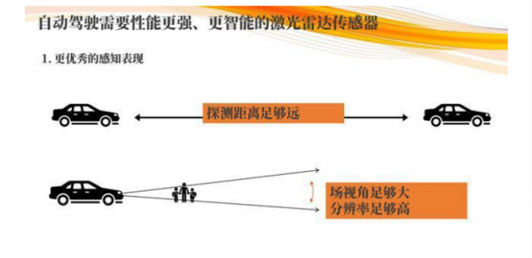 對於(yu) L3-L5從(cong) 感知的要求上來說,車輛需要有更遠的探測距離,特別是在高速上自動行駛時車輛需要更早知道遠處的路況條件,便於(yu) 探測和決(jue) 策。所以從(cong) 激光雷達的出發點和要求來看是要滿足更遠的探測距離和更廣的探測視角、更高的分辨率。