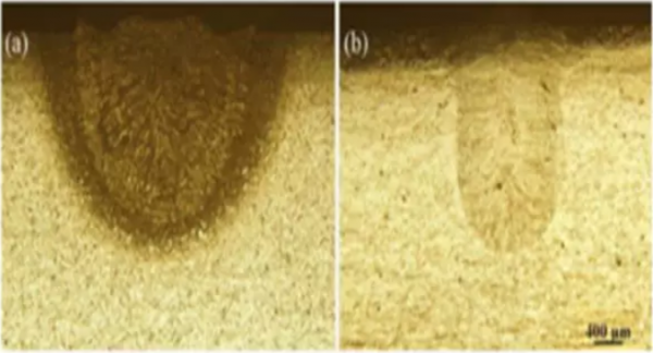 隨著功率的增加,焊縫的深度在增加,同時,激光器功率增加也會(hui) 造成熔寬的增加。