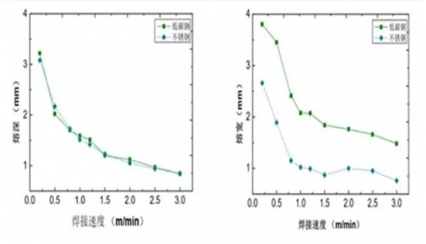 該激光焊接兩(liang) 種材料的熔寬總體(ti) 趨勢大體(ti) 相當,均隨著焊接速度的提高而減小。但相同速度下,焊接低碳鋼的熔寬明顯大於(yu) 不鏽鋼。這與(yu) 固定激光功率,變化焊接速度的規律是一致的。