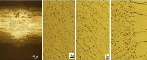 造成焊縫不同區域組織的差異主要與(yu) 凝固過程中的溫度梯度大小有關(guan) ,在焊縫中心區域由於(yu) 冷卻速度較快,熔池中心溫度梯度小,因此形成細小的等軸枝晶組織,而越靠近熔合線附近,溫度梯度越大,晶粒沿與(yu) 熔合線方向垂直向焊縫中心生長,形成略微粗大的柱狀晶組織。