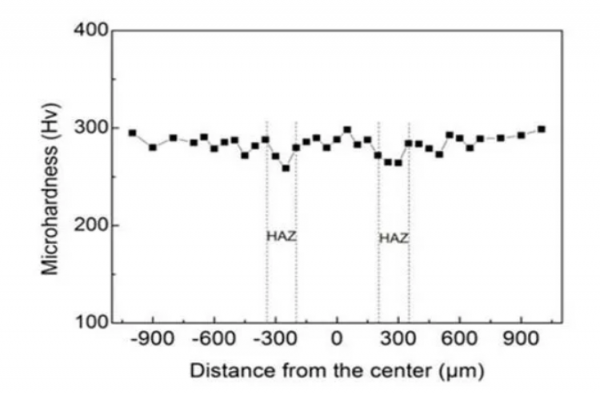 圖7為(wei) 上述激光焊接橫截麵中心區域的顯微硬度分布。可見母材的平均顯微硬度約為(wei) 280 HV,焊縫中心的平均顯微硬度約為(wei) 286 HV,焊縫區域的顯微硬度略高於(yu) 母材的顯微硬度,熱影響區平均顯微硬度最低,約為(wei) 269 HV。焊縫的顯微硬度並沒有顯著的差異,其接頭沒有出現明顯的軟化現象。