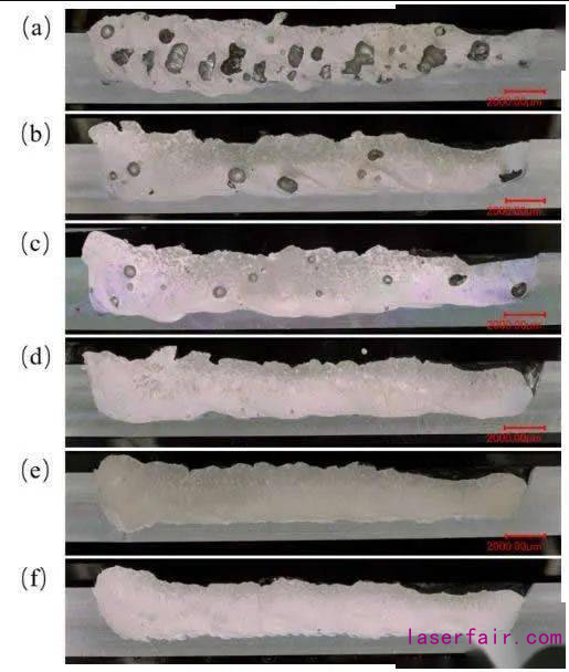 圖3.焊接參數對焊縫縱截麵氣孔變化的影響 (a) 直線路徑,3.0m/min焊接速度;(b) 擺動路徑,擺幅0.4mm;(c) 擺動路徑,擺幅0.6mm;(d) 擺動路徑,擺幅0.8mm;(e) 擺動路徑,擺幅1.0mm;(f) 擺動路徑,擺幅1.2mm;其中(b)-(f)焊接速度為(wei) 43.5m/min。