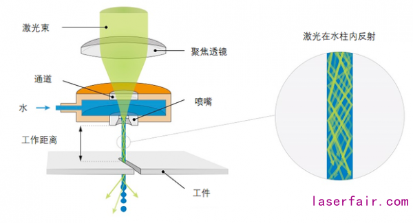 從(cong) 噴嘴到切割工件上的這段距離,激光束並不會(hui) 分散,而是在水柱中不斷反射前進,原理上類似於(yu) 光纖傳(chuan) 輸,激光束可以在長達10cm的距離被引導,從(cong) 而實現整齊的切縫,無需再次聚焦或距離控製。